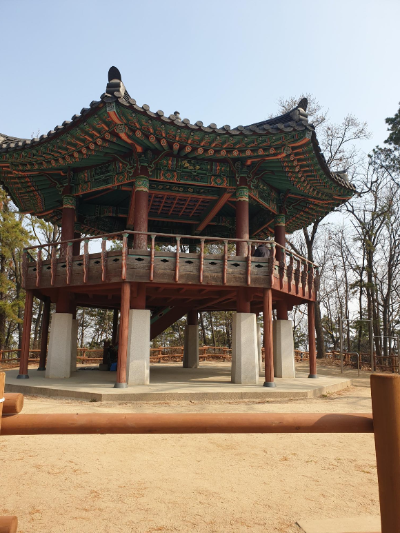 산 정상에서는 팔각정(정자)를 만날 수 있습니다. 철봉등 운동 기구들이 좀 있어서, 가벼운 운동을 즐길 수 있습니다.