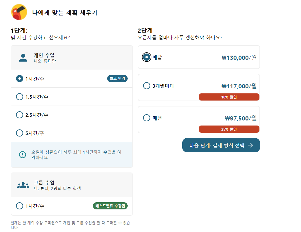 그리고, 기존에 주 15분 몇회, 주 30분 몇 회 이렇게 결제 하던 방식이 얼마 전부터 이렇게 바뀌더니, 이제는 주 1시간, 1.5시간, 2.5시간, 5시간으로 나눠서 결제를 하게 바뀌었다. 결제를 하면 주당 시간 안에서 15분, 30분, 길게 가능한 것 은 1시간 수업도 가능하게 바뀐 것 같다.