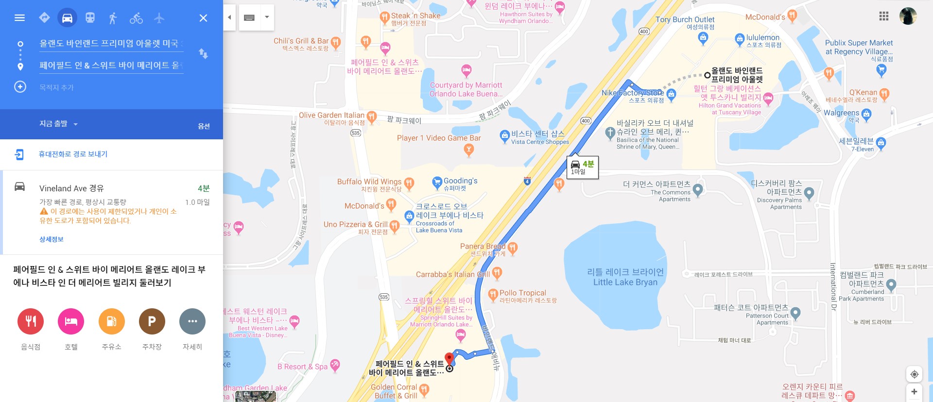 숙소 : Fairfield Inn & Suites by Marriott Orlando Lake Buena Vista in the Marriott Village 미국 32821 Florida, Orlando, Vineland Ave |